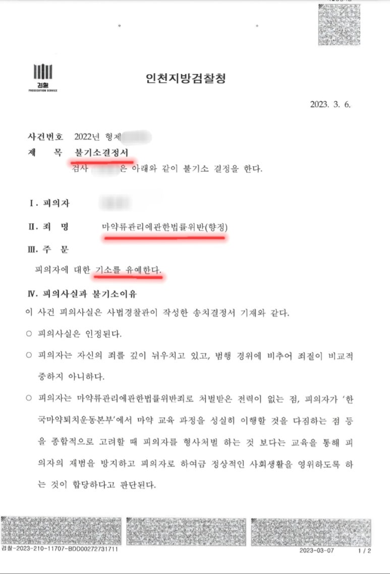 “마약 1회 투약도 전과 남습니다” 그런데 이 사건은 불기소였습니다