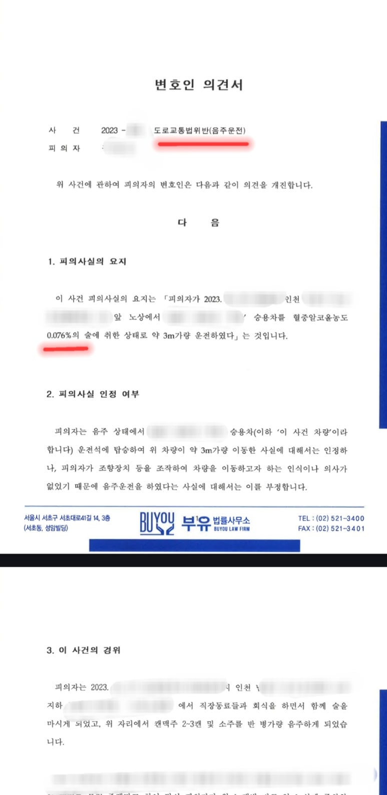 의뢰인이 혈중알코올농도 약 0.076퍼센트 상태에서 도로 위에서 약 3미터가량 차량을 이동시켰고 이로 인해 도로교통법상 음주운전에 해당한다는 취지였습니다.