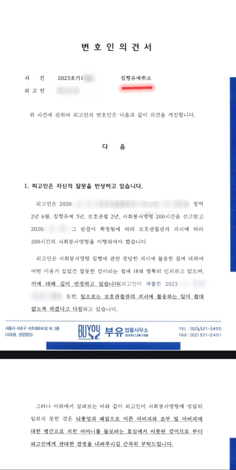 집행유예취소신청서에는 “의뢰인의 모친이 불참 사유를 허위로 보고한 것 같다”는