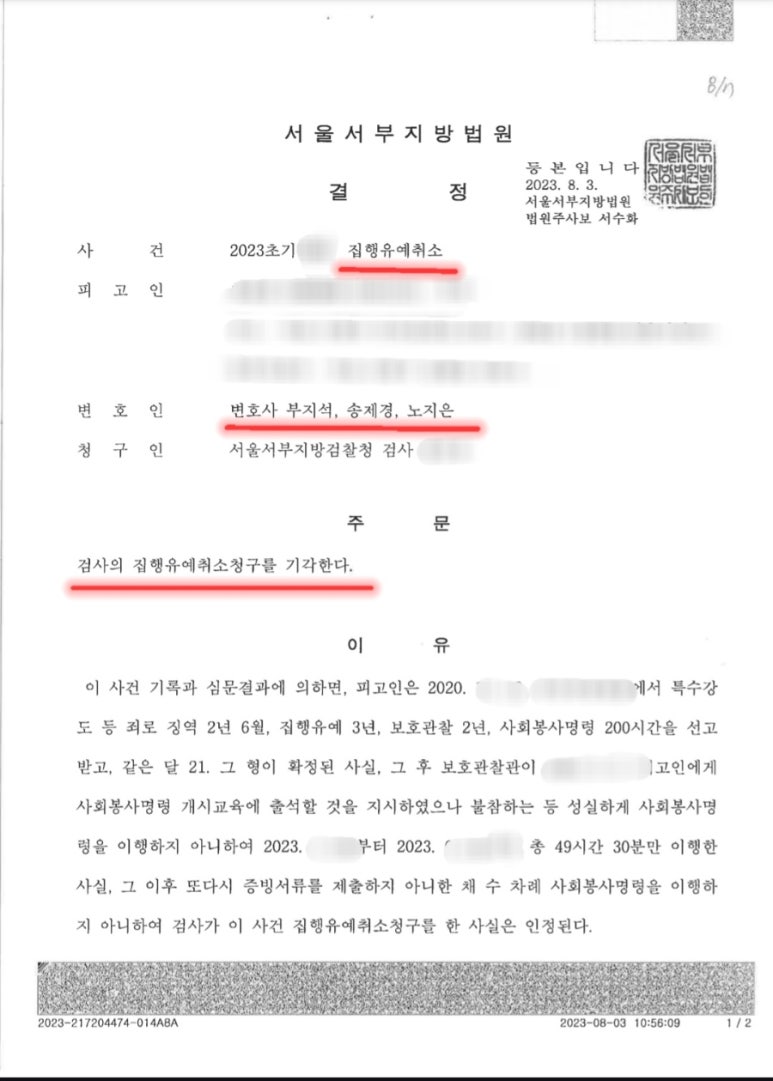 서울서부지방법원은 법무법인 부유의 주장을 받아들여 검사의 집행유예취소 신청을 기각하였습니다.