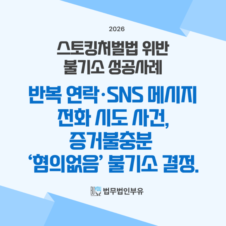 검찰은 불기소결정서에서 이 사건 각 행위들에 대해 스토킹처벌법상 요구되는 지속성·반복성 요건이 충족된다고 보기 어렵고, 개별 행위들 사이의 시간적 간격, 간격, 각 행위의 성격 등에 비추어 지속적·반복적 스토킹행위라고 인정하기 어렵다고 판단하였습니다. 결국 이는 법무법인 부유가 사건 초반부터 유지한 핵심 논리가 실질적으로 받아들여진 결과라고 볼 수 있습니다.